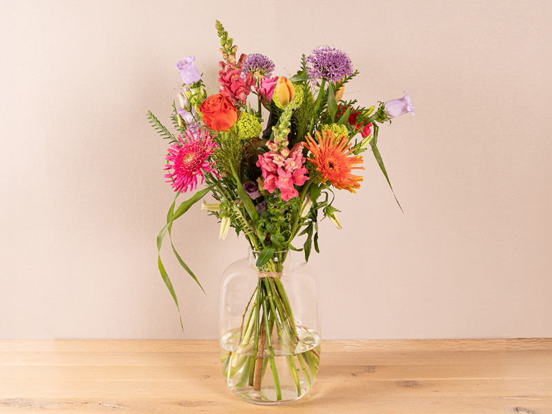 Kleurrijk boeket met warme en levendige accenten, luchtig geschikt met weelderig groen.